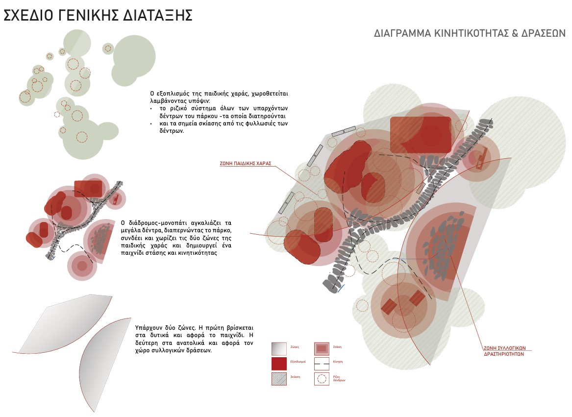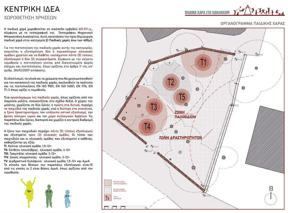 Η παιδική χαρά συμμορφώνεται με την ελληνική νομοθεσία για τις παιδικές χαρές, η οποία απαιτεί τουλάχιστον πέντε είδη εξοπλισμού για πολλές ηλικιακές ομάδες. Η παιδική χαρά χωρίζεται σε δύο ζώνες. Η δυτική ζώνη διαθέτει εξοπλισμό για παιδιά ηλικίας 1,5-12+ ετών. Περιλαμβάνει κούνιες (1), ένα συγκρότημα τσουλήθρας (2), μια κούνια (3), μια δοκό ισορροπίας(4) και ένα διαδραστικό ξυλόφωνο για χρήστες με ειδικές ανάγκες (5). Η ανατολική ζώνη θα χρησιμοποιείται για εκδηλώσεις και περιλαμβάνει παγκάκια (6), τραπέζια πικνίκ (7) και σιντριβάνι (8). Ο σχεδιασμός περιλαμβάνει χαρακτηριστικά προσβασιμότητας, όπως έναν κεντρικό διάδρομο για την πρόσβαση ατόμων με αναπηρία και κοντινό χώρο στάθμευσης στην άκρη του δρόμου.