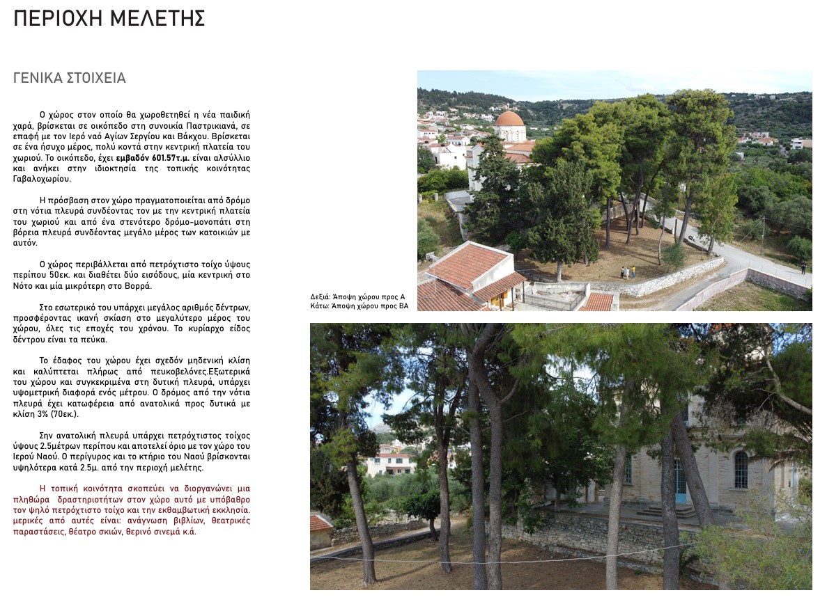 Η παιδική χαρά θα βρίσκεται σε δασική έκταση στην περιοχή Παστρικιανά του Γαβαλοχωρίου. Βρίσκεται δίπλα στην εκκλησία των Αγίων Σεργίου και Βάκχου και κοντά στην κεντρική πλατεία του χωριού. Τα δέντρα του χώρου παρέχουν φυσική σκιά, ενώ η παιδική χαρά περιβάλλεται από χαμηλό πέτρινο τοίχο με μεταλλικό φράχτη στην κορυφή του για λόγους ασφαλείας.