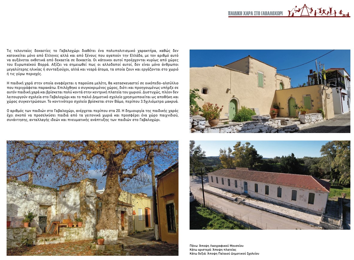 Σε μια εποχή όπου οι οθόνες κυριαρχούν, το παιχνίδι στη φύση είναι πιο πολύτιμο από ποτέ. Στο Γαβαλοχώρι Αποκορώνου, η απουσία μιας λειτουργικής παιδικής χαράς έχει αφήσει ένα σημαντικό κενό στην κοινότητά μας. Οι κάποτε υπάρχουσες παιδικές χαρές έχουν περιέλθει σε κατάσταση αποσύνθεσης, χωρίς να υπάρχει ασφαλής, καθορισμένος χώρος για να παίζουν τα παιδιά και να κοινωνικοποιούνται, στερώντας από τον τόπο μας έναν τόπο χαράς και συνάντησης.